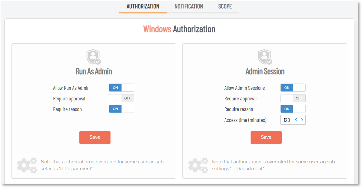 For these types of scenarios, it is important to understand the different result for organizations that are using Require approval mode (where users require approval of requests before elevation) and organizations that are not (where users do not need their requests approved in order to gain elevation). An example of a portal setting that illustrates approval not required is shown in the following image: