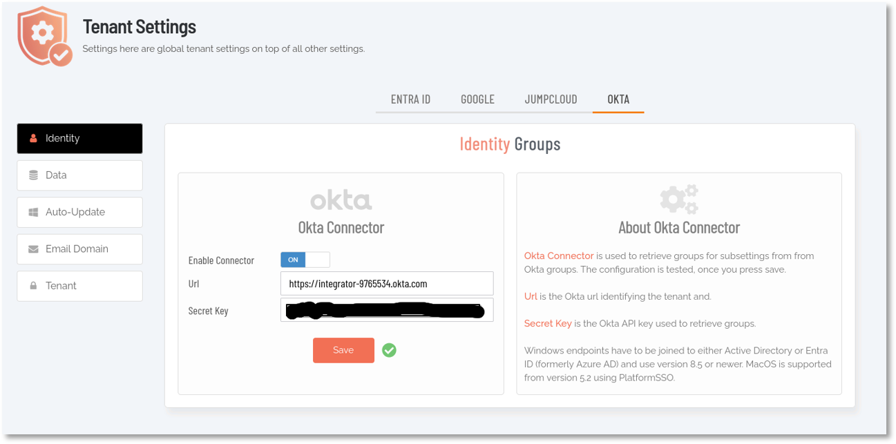 Portal menu: Settings > Tenant Settings > Identity > OKTA