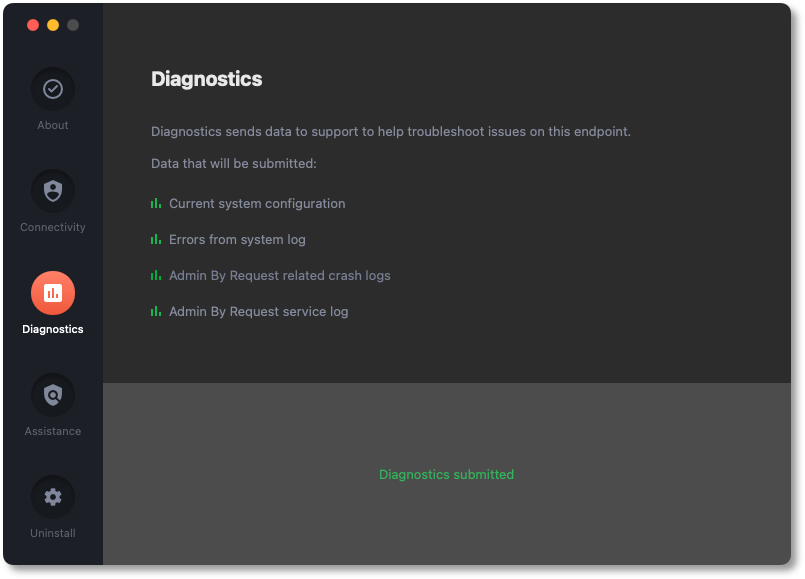 It's a good idea to submit diagnostics when raising a support ticket for a new issue. The Admin By Request support team will frequently ask for diagnostics when responding to tickets if the information is not already available.