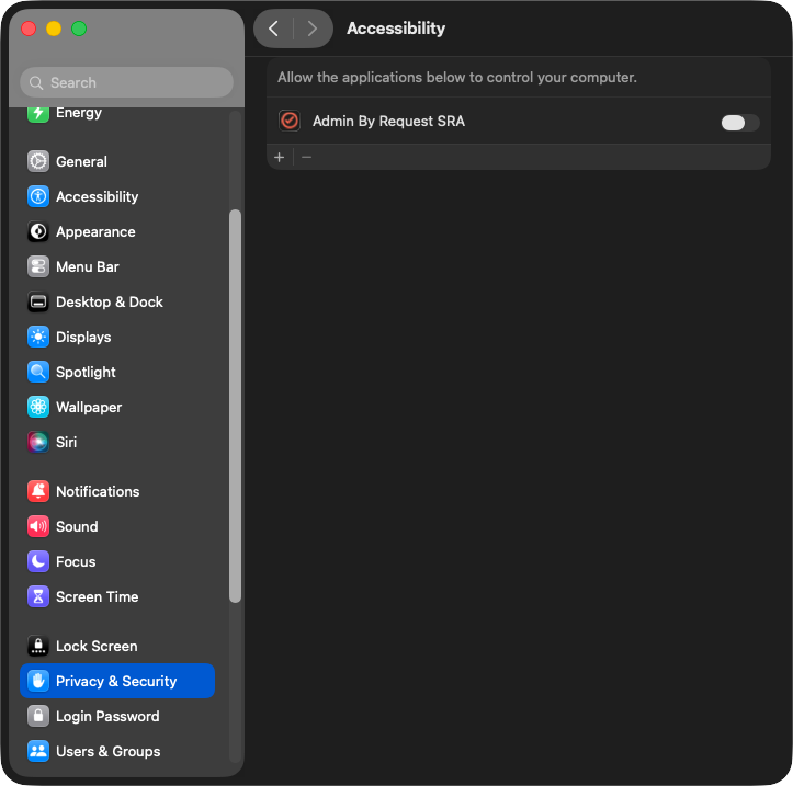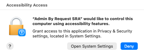 When this appears, click Open System Settings, go to Privacy & Security > Accessibility and enable Admin By Request SRA:
