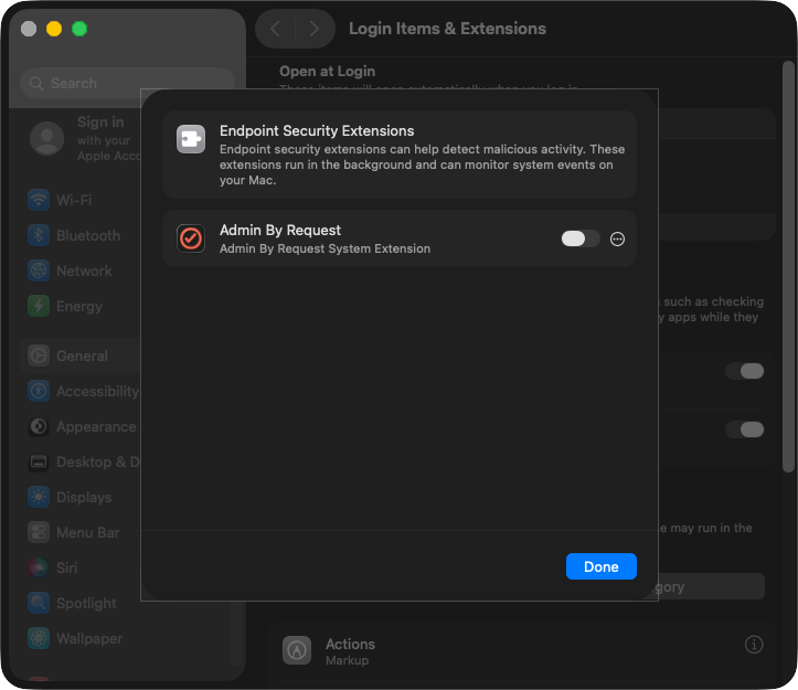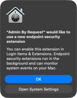 Admin By Request for Mac 5.0 and higher includes an optional system extension to add additional functionality to the client – including intuitive installation of applications and additional admin entries for the auditlog.