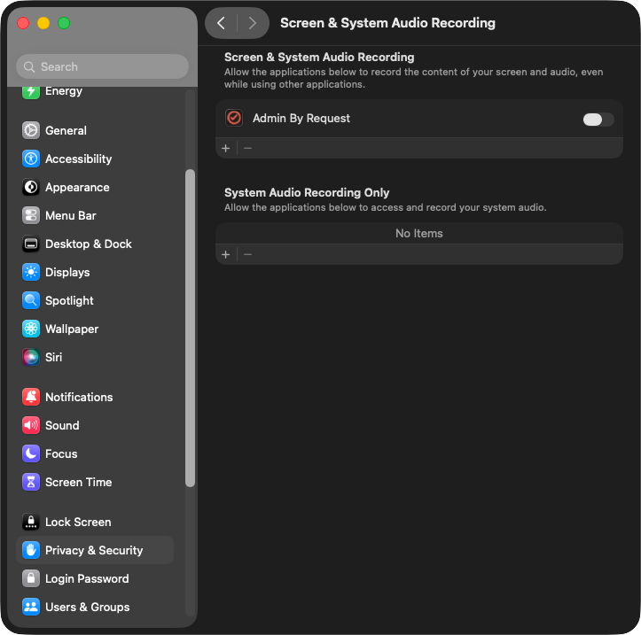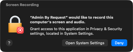 In Screen & System Audio Recording, enable Admin By Request: