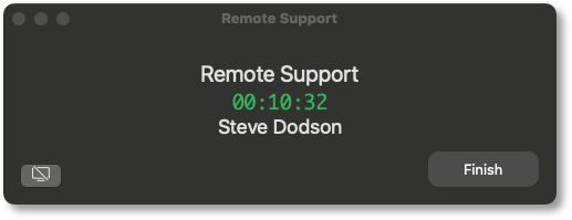 8. The duration of an admin session is set via the portal (15 minutes in this example) and the countdown timer ticks down to zero, at which time the session ends. The user can optionally end the session at any time once it has started by clicking Finish.