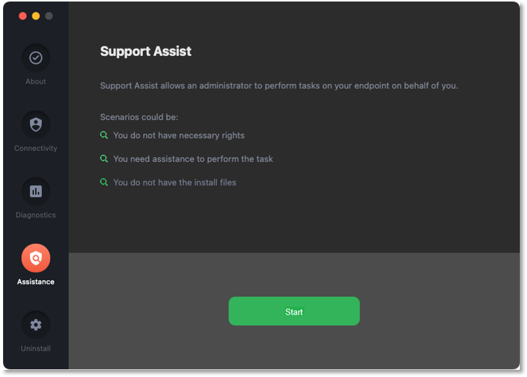 Support Assist  is a feature that allows users to ask for help from someone who can connect remotely to the user's computer and provide technical assistance with tasks that the logged-in user would not normally be able to complete. The feature is accessible via the Assistance button in the user interface.