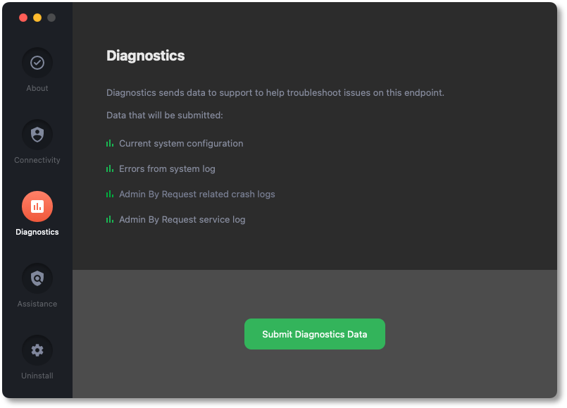 To send diagnostic information about how Admin By Request is running on this workstation, select the Diagnostics button on the About Admin By Request panel and click Submit Diagnostics Data.