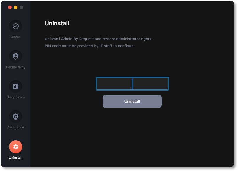 Offline users can obtain a challenge/response PIN, which allows the user to perform tasks requiring elevated privileges. A PIN Code can also be used to uninstall Admin By Request when online and this is the purpose of the Uninstall panel in the About Admin By Request window.
