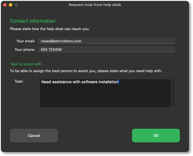 3. This prompts the user for contact information as well as a reason for the Remote Support request: