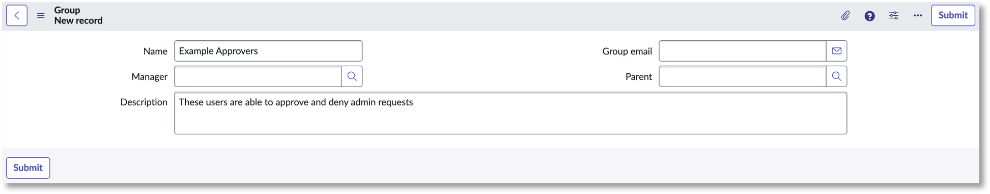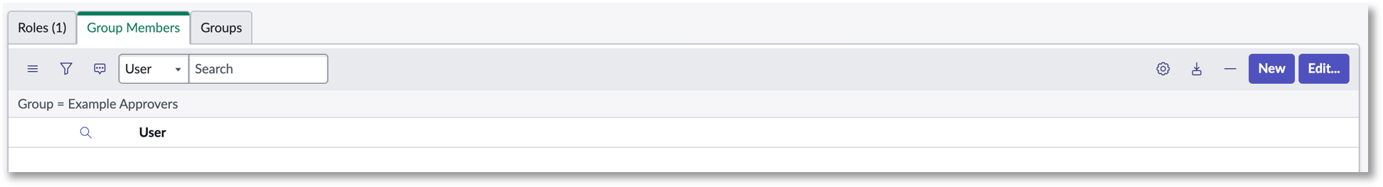In this example, we assign an Example Approvers group the role of User, which allows them to Approve or Deny requests within ServiceNow.