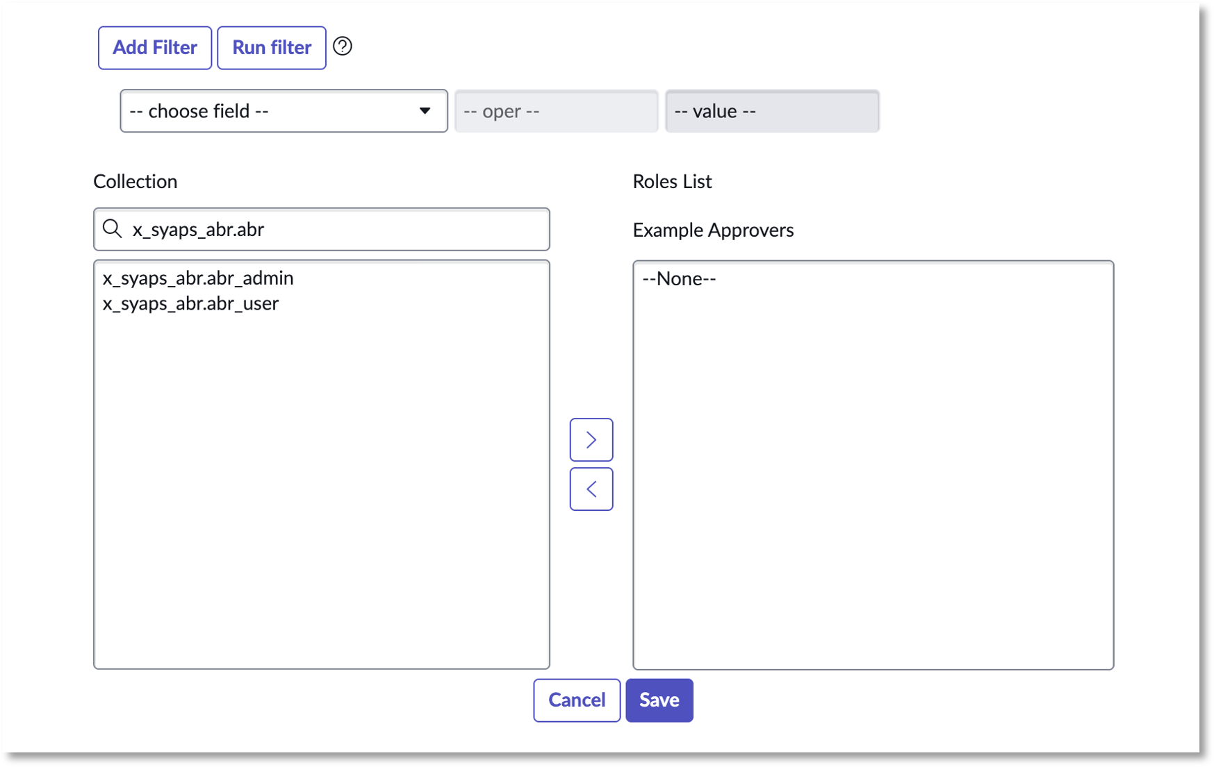 x_syaps_abr.abr_admin: Users assigned this role have administrative access within the application, which includes the ability to access all application features (Requests, Auditlog) and the Properties page.