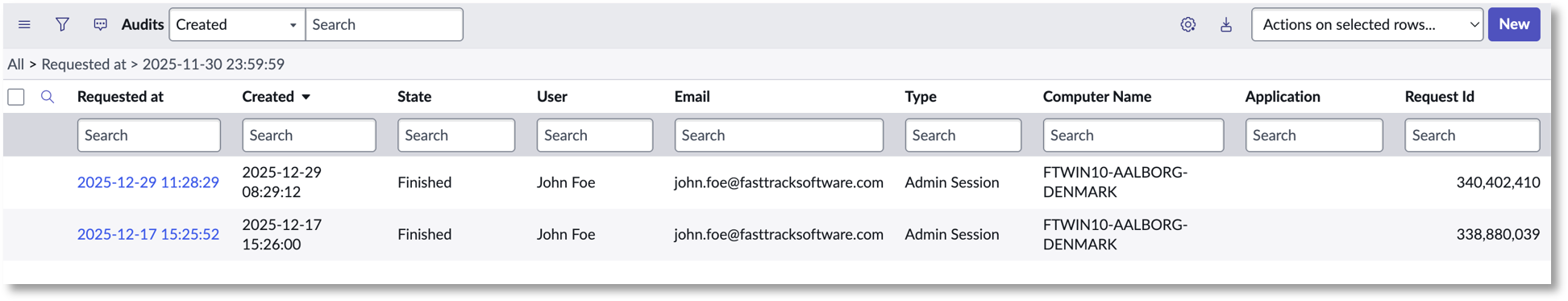 The Auditlog page displays all of the recent Auditlog data from Run As Admin and Admin Session requests. Information includes: