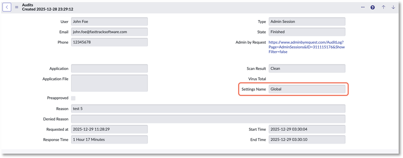The value in the Settings Name field (Global in this example) represents the Admin By Request portal setting or sub-setting used for the request. Settings Name is available in both Requests and Auditlog data and can be used in internal workflows.