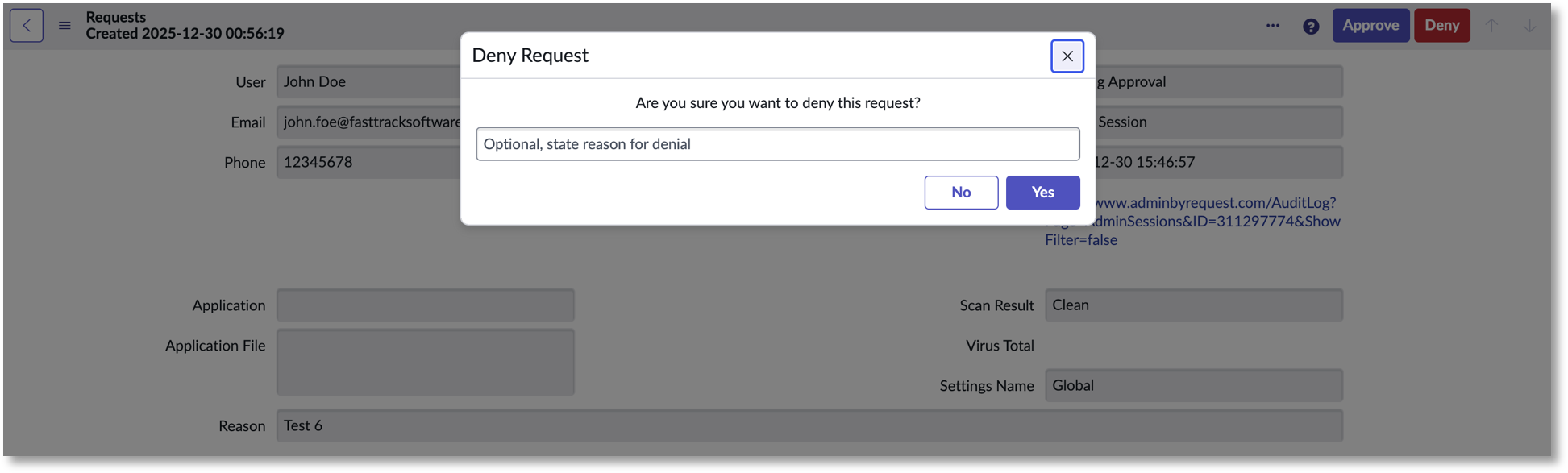 A confirmation window appears following this action. Click Yes to deny the request, with the option of stating a reason for denial: