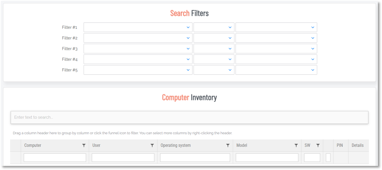 Use this button to search the inventory. Either use the Search Filters or right-click the table column headings and select any combination of the options available for further group, search and filter options.